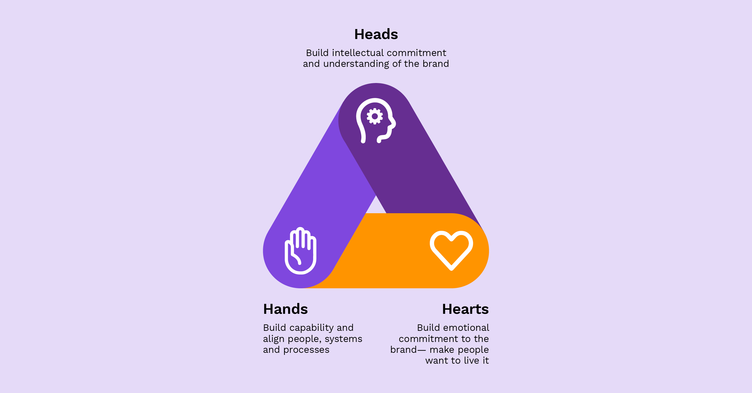 Three streams of work are typically required to embed and nurture these – something we call heads, hands and hearts. Building understanding of and commitment to what you stand for. Building emotional buy-in, so people want to be part of this. And weaving purpose, values and beliefs into your systems and processes – with new tools and communications as required.
